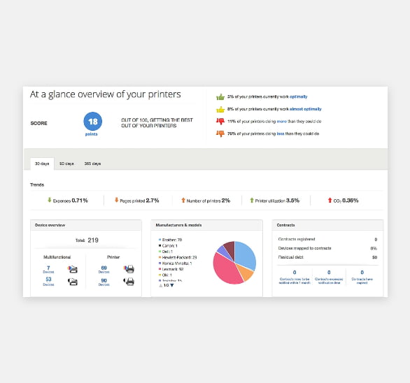 Prikaz podatkov na začetni strani nam odlično prikazuje celoten pregled, kako delujejo vsi tiskalniki v mreži ne glede na znamko tiskalnikov.